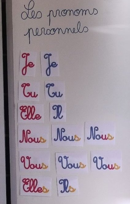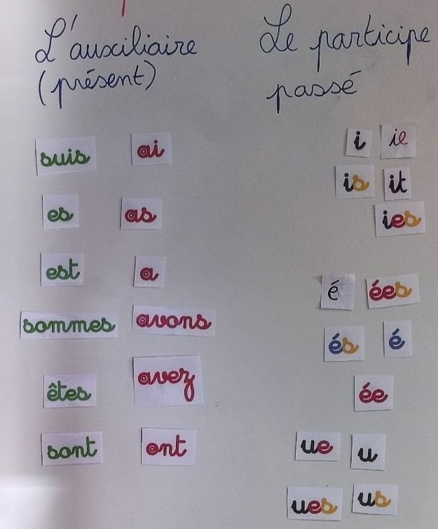 L’élève doit prendre les étiquettes sujet et auxiliaire et moi j’écris le radical au tableau. Ensuite, l’élève le complète avec la bonne terminaison. La validation (ou non) de la réponse est plus facile à justifier grâce au code couleur !